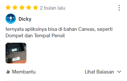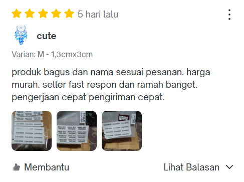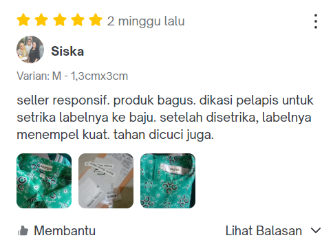 Seller responsif produk bagus dikasih pelapis untuk setrika labelnya ke baju. setelah di setrika labelnya menempel kuat tahan cuci juga
