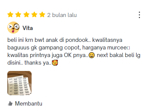 Beli ini krn bwt anak di pondok, kwalitasnya bagus ,, gak gampang copot harganya murcee kwalitas print nya juga oke punya next bakal beli lagi disini thanks ya